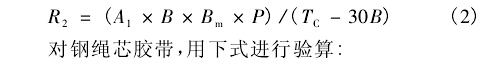 由式1可計算得出凹弧段的最小半徑。但是當(dāng)膠帶的張力過低時,膠帶的邊緣處有可能產(chǎn)生皺曲,將無法保證皮帶輸送機的安全運行,因此需對該半徑值進行必要的校核。鑒于目前國內(nèi)尚無成熟的計算公式可循,建議采用美國輸送設(shè)備制造商協(xié)會聯(lián)合會推薦的公式對最小半徑進行驗算,以保證膠帶具有足夠張力,避免在凹弧段處的膠帶邊緣出現(xiàn)零張力'對織物芯膠帶,用下式進行驗算: